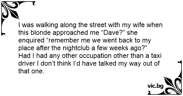 I was walking along the street with my wife when this blonde approached me “Dave?” she enquired “remember me we went back to my place after the nightclub a few weeks ago?”
