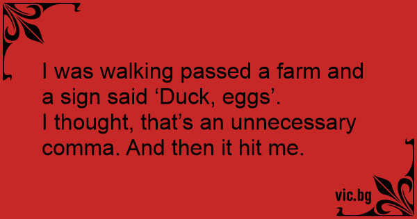 I was walking passed a farm and a sign said ‘Duck, eggs’.