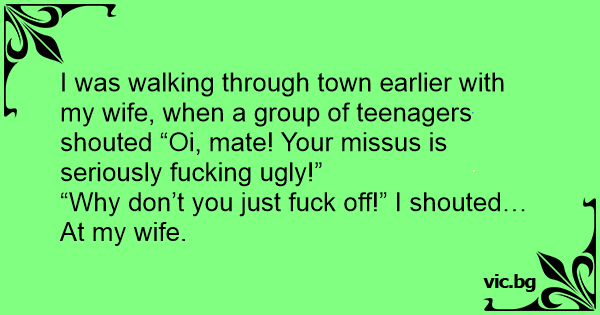 I was walking through town earlier with my wife, when a group of teenagers shouted “Oi, mate! Your missus is seriously fuскing ugly!”