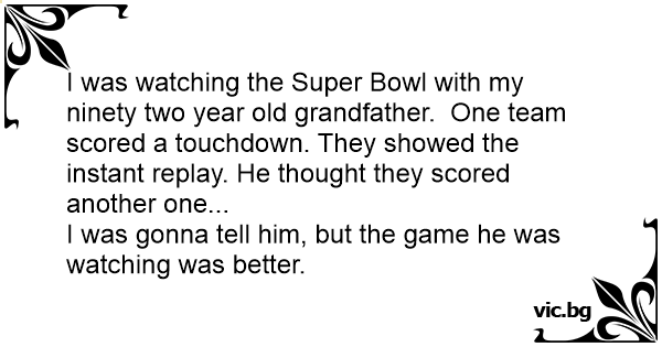 I was watching the Super Bowl with my ninety two year old grandfather. One team scored a touchdown. They showed the instant replay. He thought they scored another one...