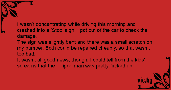 I wasn’t concentrating while driving this morning and crashed into a ‘Stop’ sign. I got out of the car to check the damage.