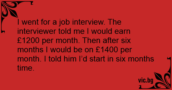 I went for a job interview. The interviewer told me I would earn £1200 per month. Then after six months I would be on £1400 per month. I told him I’d start in six months time.