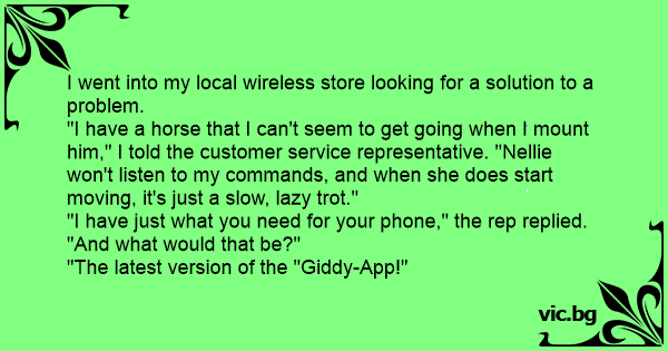 "I have a horse that I can't seem to get going when I mount him," I told the customer service representative. "Nellie won't listen to my commands, and when she does start moving, it's just a slow, lazy trot."
