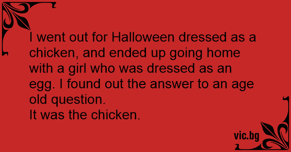 I went out for Halloween dressed as a chicken, and ended up going home with a girl who was dressed as an egg. I found out the answer to an age old question.