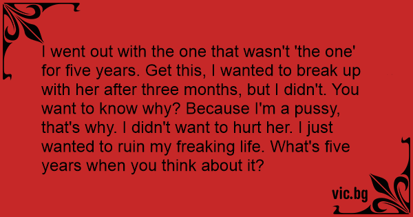 I went out with the one that wasn't 'the one' for five years. Get this, I wanted to break up with her after three months, but I didn't. You want to know why? Because I'm a рussy, that's why. I didn't want to hurt her. I just wanted to ruin my freaking life. What's five years when you think about it?