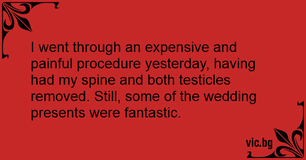Вчера преживях скъпа и болезнена процедура, премахнаха ми гръбнака и двата тестиса. Все пак някои от сватбените подаръци не бяха лоши