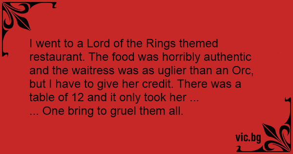 I went to a Lord of the Rings themed restaurant. The food was horribly authentic and the waitress was as uglier than an Orc, but I have to give her credit. There was a table of 12 and it only took her ...