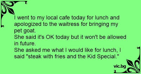 I went to my local cafe today for lunch and apologized to the waitress for bringing my pet goat.