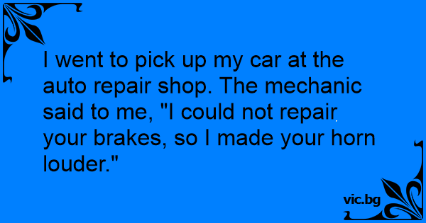 I went to pick up my car at the auto repair shop. The mechanic said to me, "I could not repair your brakes, so I made your horn louder."