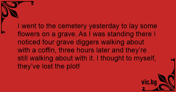 I went to the cemetery yesterday to lay some flowers on a grave. As I was standing there I noticed four grave diggers walking about with a coffin, three hours later and they’re still walking about with it. I thought to myself, they’ve lost the plot!