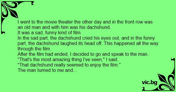 I went to the movie theater the other day and in the front row was an old man and with him was his dachshund.