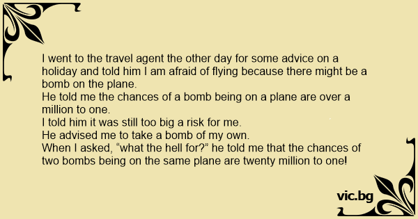 I went to the travel agent the other day for some advice on a holiday and told him I am afraid of flying because there might be a bomb on the plane.