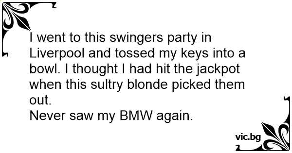 I went to this swingers party in Liverpool and tossed my keys into a bowl. I thought I had hit the jackpot when this sultry blonde picked them out.