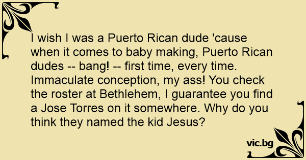 I wish I was a Puerto Rican dude 'cause when it comes to baby making, Puerto Rican dudes -- ваng! -- first time, every time. Immaculate conception, my аss! You check the roster at Bethlehem, I guarantee you find a Jose Torres on it somewhere. Why do you think they named the kid Jesus?