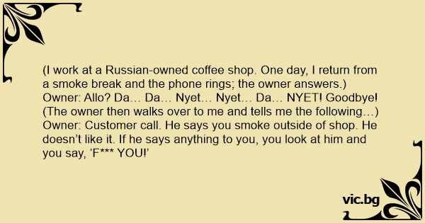 (I work at a Russian-owned coffee shop. One day, I return from a smoke break and the phone rings; the owner answers.)