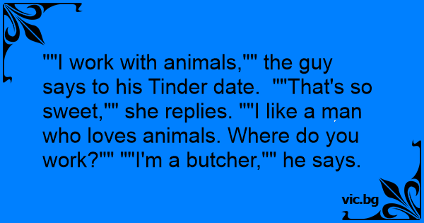 ""I work with animals,"" the guy says to his Tinder date. ""That's so sweet,"" she replies. ""I like a man who loves animals. Where do you work?"" ""I'm a butcher,"" he says.