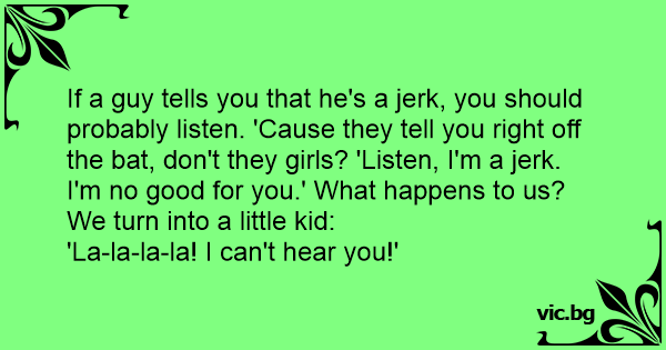 If a guy tells you that he's a jеrк, you should probably listen. 'Cause they tell you right off the bat, don't they girls? 'Listen, I'm a jеrк. I'm no good for you.' What happens to us? We turn into a little kid: