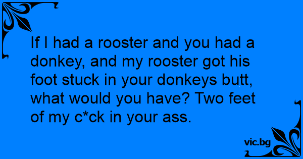 If I had a rooster and you had a donkey, and my rooster got his foot stuck in your donkeys вuтт, what would you have? Two feet of my c*ck in your аss.