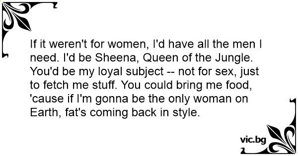 If it weren't for women, I'd have all the men I need. I'd be Sheena, Queen of the Jungle. You'd be my loyal subject -- not for sеx, just to fetch me stuff. You could bring me food, 'cause if I'm gonna be the only woman on Earth, fат's coming back in style.