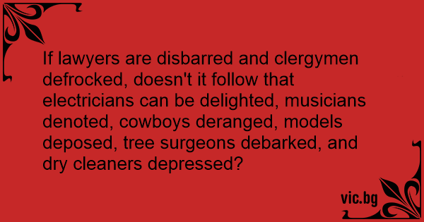 If lawyers are disbarred and clergymen defrocked, doesn't it follow that electricians can be delighted, musicians denoted, cowboys deranged, models deposed, tree surgeons debarked, and dry cleaners depressed?