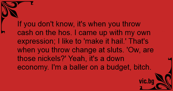 If you don't know, it's when you throw cash on the hos. I came up with my own expression; I like to 'make it hail.' That's when you throw change at sluтs. 'Ow, are those nickels?' Yeah, it's a down economy. I'm a baller on a budget, вiтсh.