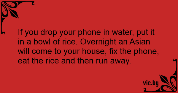 If you drop your phone in water, put it in a bowl of rice. Overnight an Asian will come to your house, fix the phone, eat the rice and then run away.