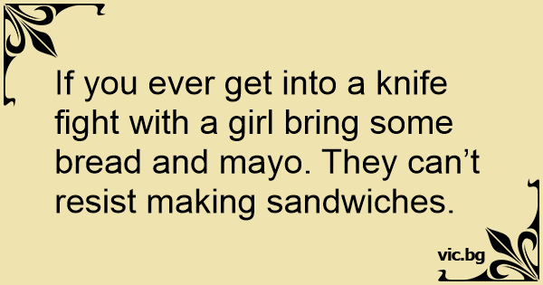 If you ever get into a knife fight with a girl bring some bread and mayo. They can’t resist making sandwiches.