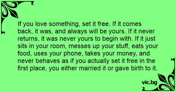 If you love something, set it free. If it comes back, it was, and always will be yours. If it never returns, it was never yours to begin with. If it just sits in your room, messes up your stuff, eats your food, uses your phone, takes your money, and never behaves as if you actually set it free in the first place, you either married it or gave birth to it.