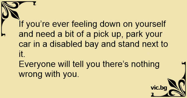 If you’re ever feeling down on yourself and need a bit of a pick up, park your car in a disabled bay and stand next to it.