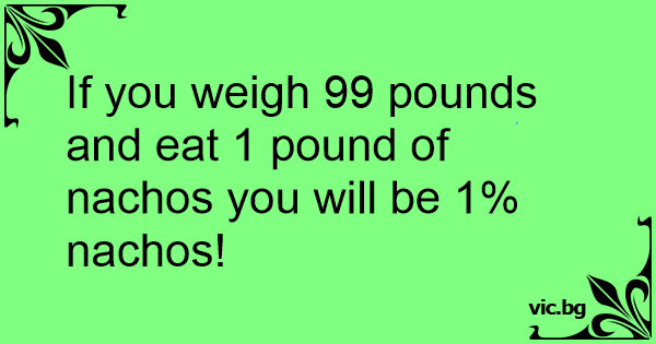 If you weigh 99 pounds and eat 1 pound of nachos you will be 1% nachos!