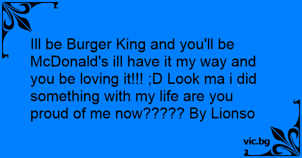 Ill be Burger King and you'll be McDonald's ill have it my way and you be loving it!!! ;D Look ma i did something with my life are you proud of me now????? By Lionso