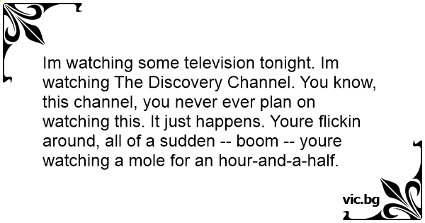 Im watching some television tonight. Im watching The Discovery Channel. You know, this channel, you never ever plan on watching this. It just happens. Youre flickin around, all of a sudden -- boom -- youre watching a mole for an hour-and-a-half.