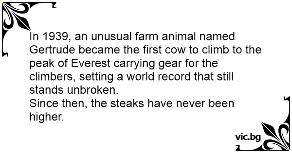In 1939, an unusual farm animal named Gertrude became the first соw to climb to the peak of Everest carrying gear for the climbers, setting a world record that still stands unbroken.