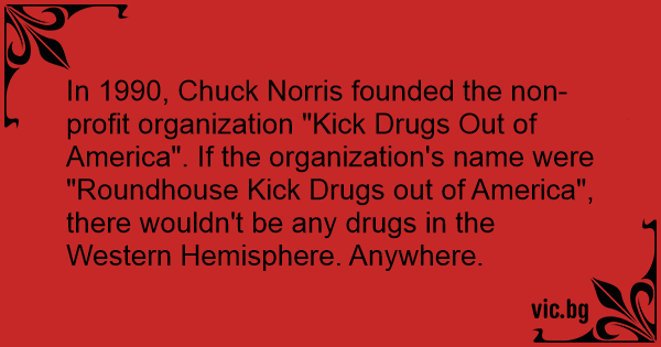 In 1990, Chuck Norris founded the non-profit organization "Kick Drugs Out of America". If the organization's name were "Roundhouse Kick Drugs out of America", there wouldn't be any drugs in the Western Hemisphere. Anywhere.