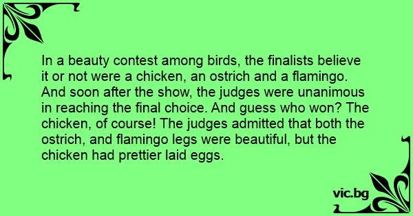 In a beauty contest among birds, the finalists believe it or not were a chicken, an ostrich and a flamingo. And soon after the show, the judges were unanimous in reaching the final choice. And guess who won? The chicken, of course! The judges admitted that both the ostrich, and flamingo legs were beautiful, but the chicken had prettier laid eggs.