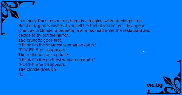 One day, a blonde, a brunette, and a redhead enter the restaurant and decide to try out the mirror.