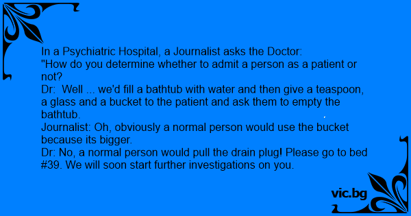 Bir akıl hastanesini ziyareti sırasında, adamın biri sorar: Bir insanın akıl hastanesine yatıp yatmayacağını nasıl belirliyorsunuz? Doktor: Bir küveti su ile dolduruyoruz. Sonra hastaya üç sey...