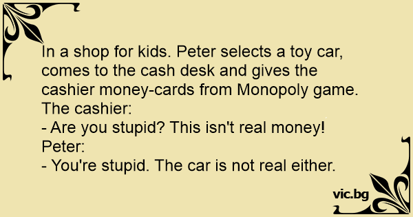 In a shop for kids. Peter selects a toy car, comes to the cash desk and gives the cashier money-cards from Monopoly game. The cashier: