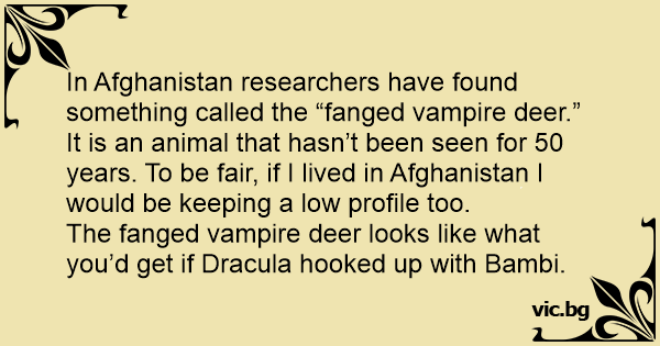 In Afghanistan researchers have found something called the “fanged vampire deer.” It is an animal that hasn’t been seen for 50 years. To be fair, if I lived in Afghanistan I would be keeping a low profile too.