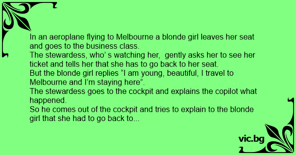 In an aeroplane flying to Melbourne a blonde girl leaves her seat and goes to the business class.