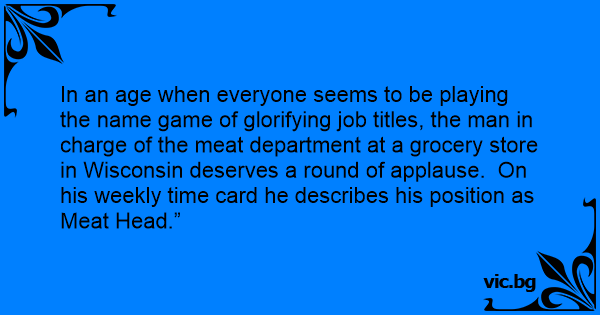 In an age when everyone seems to be playing the name game of glorifying job titles, the man in charge of the meat department at a grocery store in Wisconsin deserves a round of applause. On his weekly time card he describes his position as