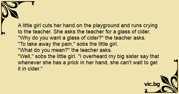 A little girl cuts her hand on the playground and runs crying to the teacher. She asks the teacher for a glass of cider.