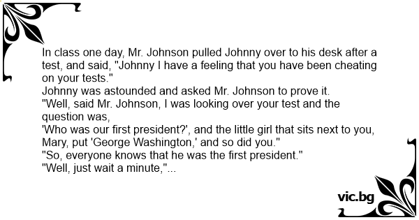 In class one day, Mr. Johnson pulled Johnny over to his desk after a test, and said, "Johnny I have a feeling that you have been cheating on your tests."