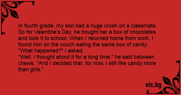 In fourth grade, my son had a huge crush on a classmate. So for Valentine’s Day, he bought her a box of chocolates and took it to school. When I returned home from work, I found him on the couch eating the same box of candy.