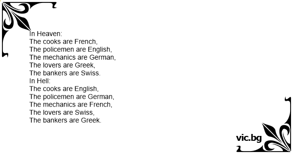 Raiul e locul unde politistii sunt englezi, bucatarii sunt italieni, mecanicii germani, iubitii francezi si organizatorii sunt elvetieni. Iadul este locul unde politistii sunt nemti, bucatarii...