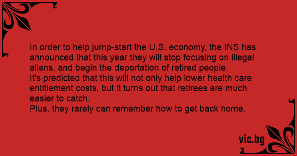 In order to help jump-start the U.S. economy, the INS has announced that this year they will stop focusing on illegal aliens, and begin the deportation of retired people.