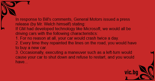 If GM had developed technology like Microsoft, we would all be driving cars with the following characteristics: