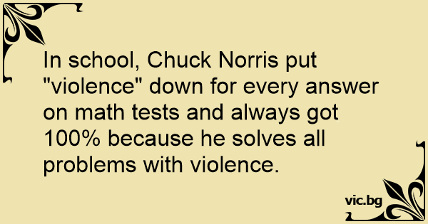 In school, Chuck Norris put "violence" down for every answer on math tests and always got 100% because he solves all problems with violence.