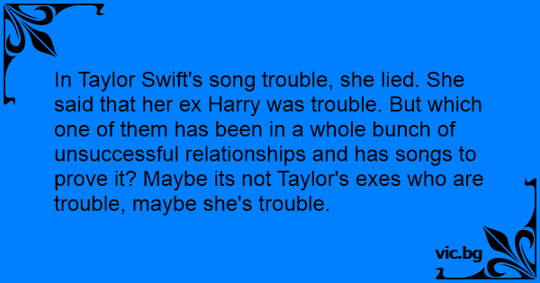 In Taylor Swift's song trouble, she lied. She said that her ex Harry was trouble. But which one of them has been in a whole bunch of unsuccessful relationships and has songs to prove it? Maybe its not Taylor's exes who are trouble, maybe she's trouble.