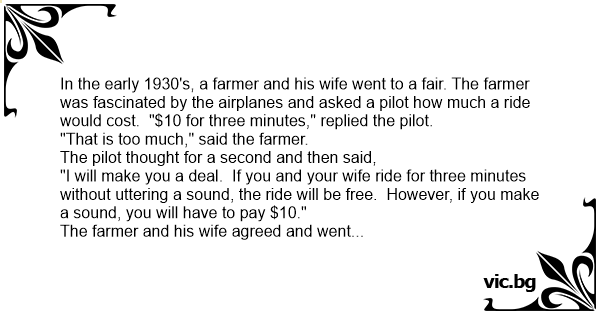 In the early 1930's, a farmer and his wife went to a fair. The farmer was fascinated by the airplanes and asked a pilot how much a ride would cost. "$10 for three minutes," replied the pilot.